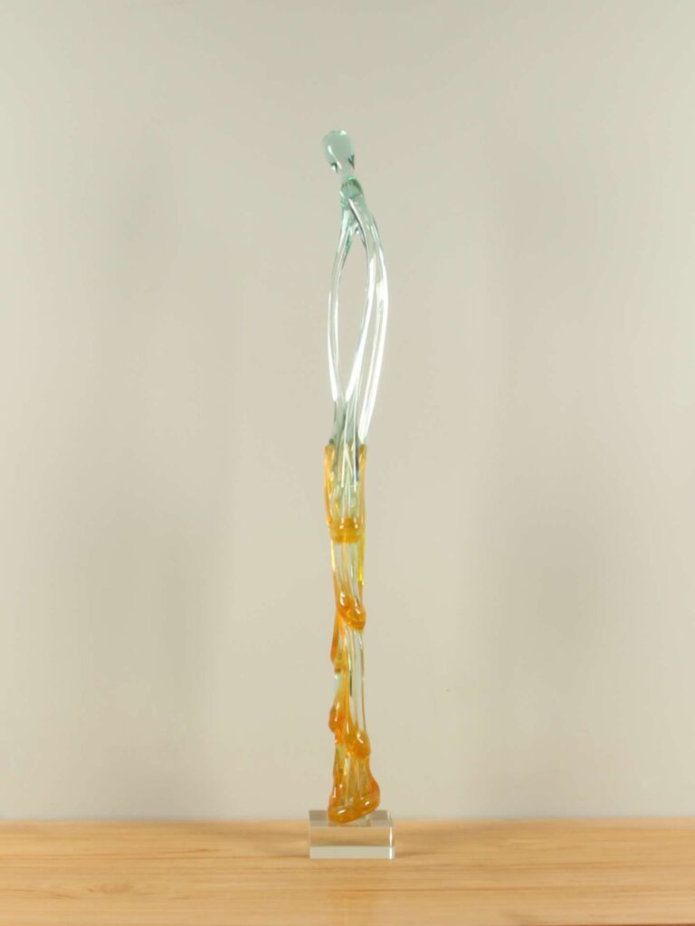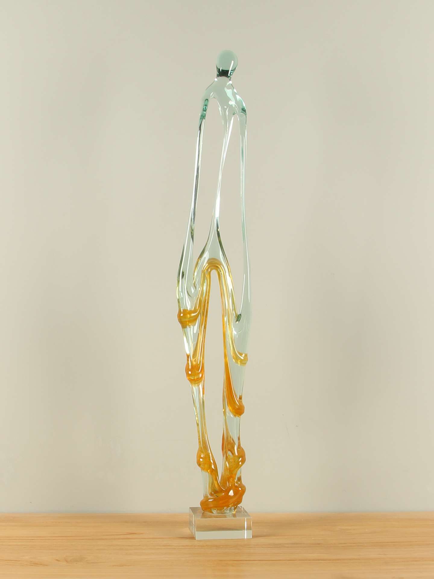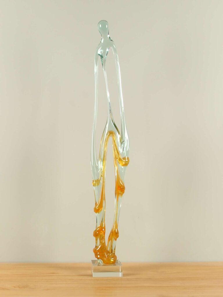 Wenn das Licht durch das Glas fällt, wirkt die Figur beinahe ätherisch. Die langen Linien und der subtile Farbverlauf verleihen der Skulptur gleichzeitig Ruhe und Dynamik und machen sie so zu einem stilvollen und künstlerischen Blickfang in jedem Raum.