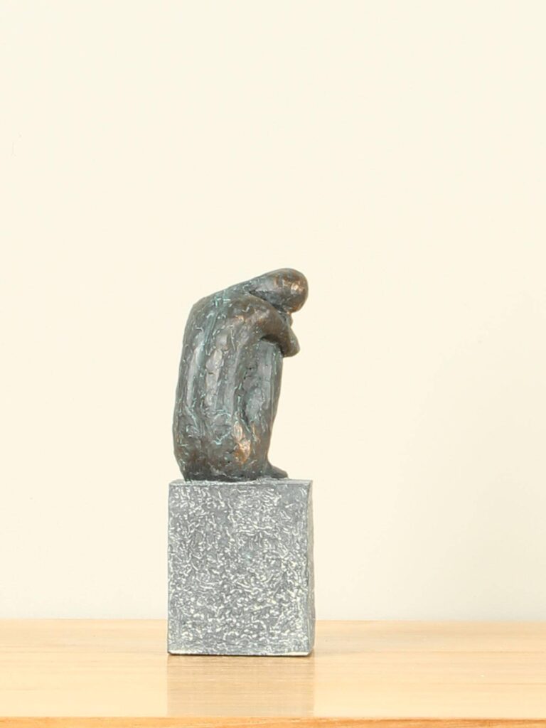 Die bronzefarbene Skulptur „Kniender Denker“ fängt einen Moment stiller Besinnung ein. Die stilisierte Figur kniet, den Kopf gesenkt, die Arme um die Beine geschlungen. Diese Pose vermittelt ein Gefühl von Innenschau, Kontemplation und Ruhe – eine Erinnerung daran, wie wertvoll es manchmal ist, innezuhalten und nachzudenken.