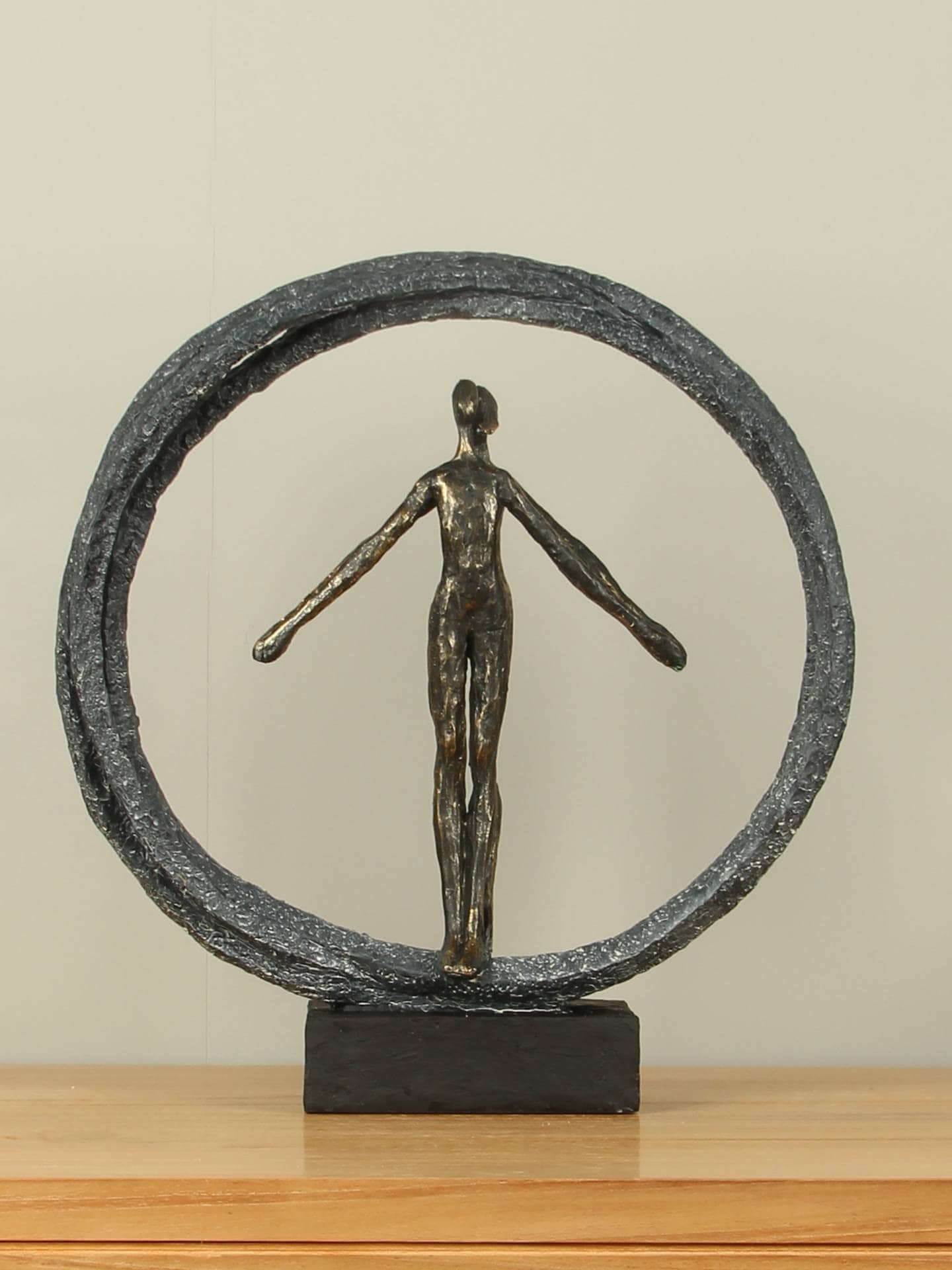 Die bronzefarbene Skulptur „Du bist im Mittelpunkt“ verkörpert auf elegante Weise die Idee, dass jeder Mensch seinen eigenen wertvollen Platz einnimmt. Die zentrale Figur steht aufrecht in einem großen Kreis, die Arme leicht ausgestreckt – eine Pose, die Frieden, Akzeptanz und Selbstvertrauen ausstrahlt. Der Kreis um die Figur symbolisiert Schutz und den Raum, der jedem Menschen zusteht. Das Ganze bildet ein kraftvolles und zeitloses Symbol für Individualität und persönliche Stärke.