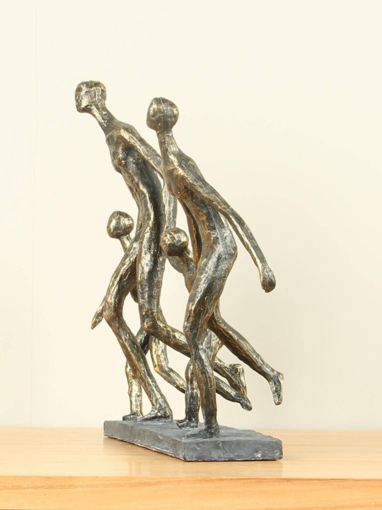 Die bronzefarbene Skulptur „Familie mit 2 Kindern“ veranschaulicht die Stärke, Freude und Dynamik des Familienlebens. Zwei Eltern gehen Hand in Hand mit ihren beiden Kindern, in einer Pose, die Bewegung und Optimismus ausstrahlt. Die stilisierten Figuren bilden ein harmonisches Ganzes, in dem jedes Familienmitglied sichtbar Teil derselben liebevollen Einheit ist. Die Szene vermittelt auf subtile und schöne Weise das Gefühl des gemeinsamen Lebensweges.