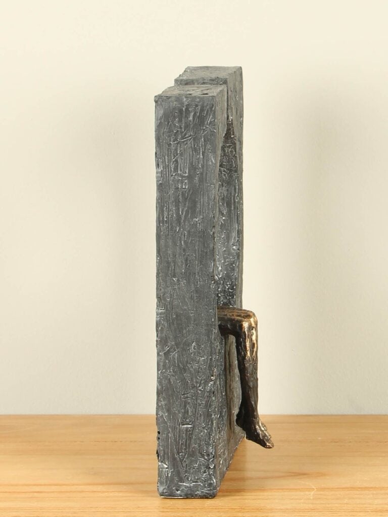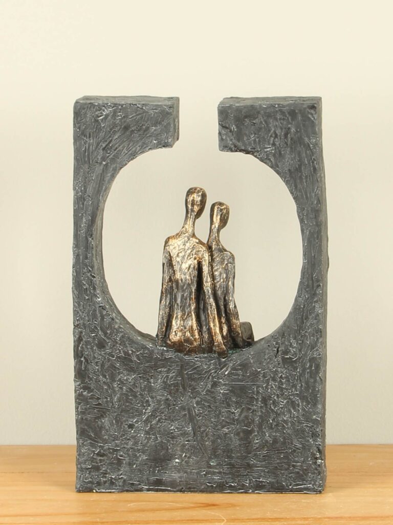 Die bronzefarbene Skulptur „Gemeinsam träumen“ ist ein zartes und symbolträchtiges Kunstwerk, das die Kraft der Verbundenheit ruhig und einfühlsam zum Ausdruck bringt. Zwei menschliche Figuren sitzen nebeneinander, entspannt aneinandergelehnt, als teilten sie still denselben Traum. Die umgebende abstrakte Form verstärkt das Gefühl von Geborgenheit und Harmonie und macht die Skulptur zu einem stilvollen Dekorationsobjekt mit tiefer emotionaler Bedeutung.