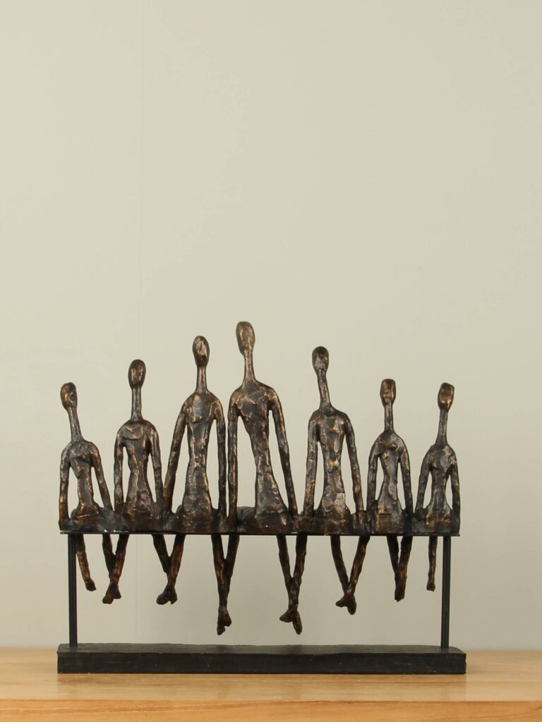Die bronzefarbene Skulptur „Sitzende Gruppe“ zeigt sechs stilisierte Figuren, die nebeneinander auf einer Bank sitzen. Die entspannte Pose und die wiederkehrenden Formen symbolisieren Zusammenhalt, Teamgeist und Zugehörigkeit. Ein stimmungsvolles und aussagekräftiges Dekorationsobjekt, geeignet für Gruppen, Familien, Teams oder Kollegen. Nur für den Innenbereich geeignet.