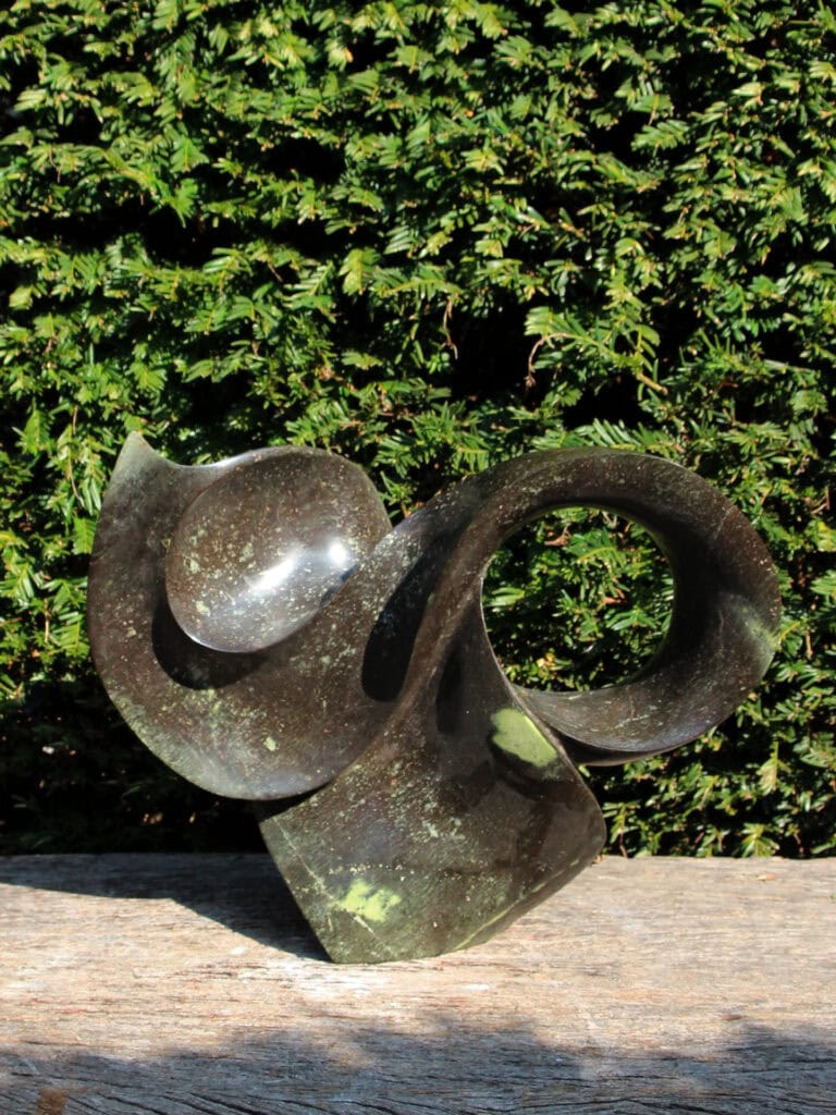 Diese Natursteinstatue aus Simbabwe wurde von einem einheimischen Künstler sorgfältig und fachmännisch handgefertigt. Jede Statue ist ein Unikat – Sie holen sich also ein wahrhaft einzigartiges Kunstwerk nach Hause.
