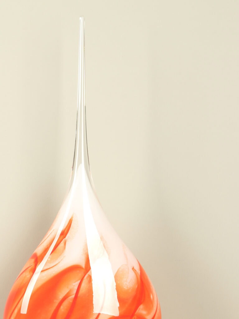 Diese einzigartige Kristallglaslampe ist ein mundgeblasenes Kunstwerk des Glaskünstlers Arno France, entstanden im renommierten Atelier von Bruno Lehrer. Jedes Stück beginnt als leuchtender Tropfen und wird vom Künstler durch Drehbewegungen so lange geformt, bis Farbe, Form und Transparenz in perfekter Harmonie stehen. Die leuchtenden Farben scheinen wie fließende Pinselstriche durch das Glas zu fließen und machen die Lampe selbst im unbeleuchteten Zustand zu einer beeindruckenden Skulptur.