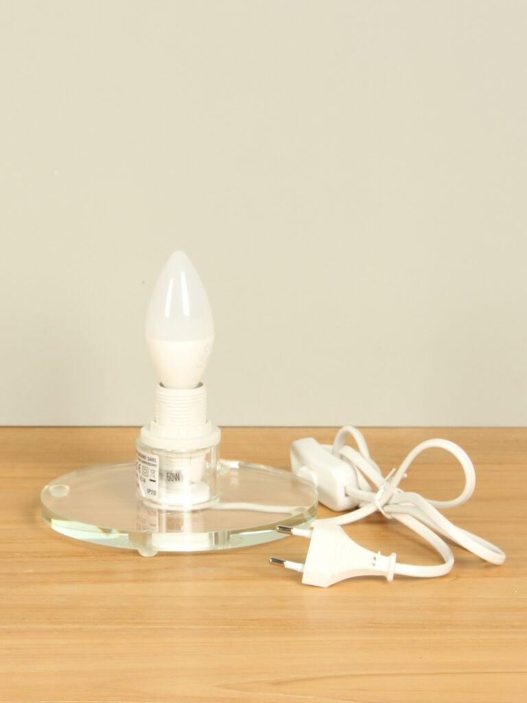 Sobald das LED-Licht eingeschaltet wird, verändert die Lampe ihren Charakter auf subtile Weise. Das Licht durchdringt die verschiedenen Glasschichten und erzeugt so warme Farbtöne, Schatten und Farbakzente. Die Lampe steht auf einem Sockel mit 16 cm Durchmesser, in den die Fassung elegant integriert ist. Dadurch ist die Lampe nicht nur ein Kunstwerk, sondern auch ein sorgfältig gestaltetes Beleuchtungsobjekt.