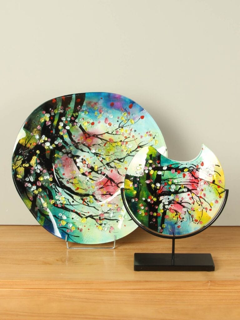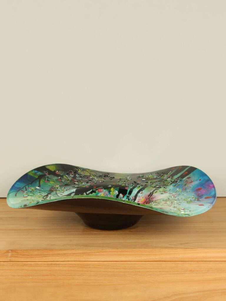 Die Schale ist als eigenständiges Dekorationsobjekt wunderschön, harmoniert aber auch perfekt mit einem passenden Sockel für eine fast museale Präsentation. Auf einem Tisch, einem Sideboard oder in einem offenen Regal verleiht sie Ihrem Interieur Farbe, Tiefe und Charakter. Ein Kunstwerk, das zum immer wieder verweilenden Betrachten einlädt.