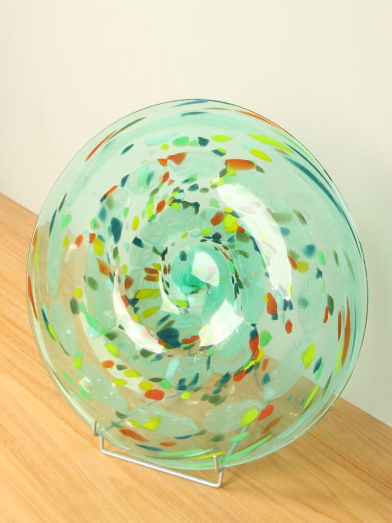 Diese handgefertigte Glasschale ist ein wahres Kunstwerk. Farben und Linien fließen harmonisch durch das Glas und machen jede Schale zu einem Unikat. Da jedes Stück handgefertigt ist, kann Ihre Schale leicht vom Foto abweichen – ein Zeichen echter Handwerkskunst. Ein wunderschönes Stück für Tisch, Sideboard oder Podest.