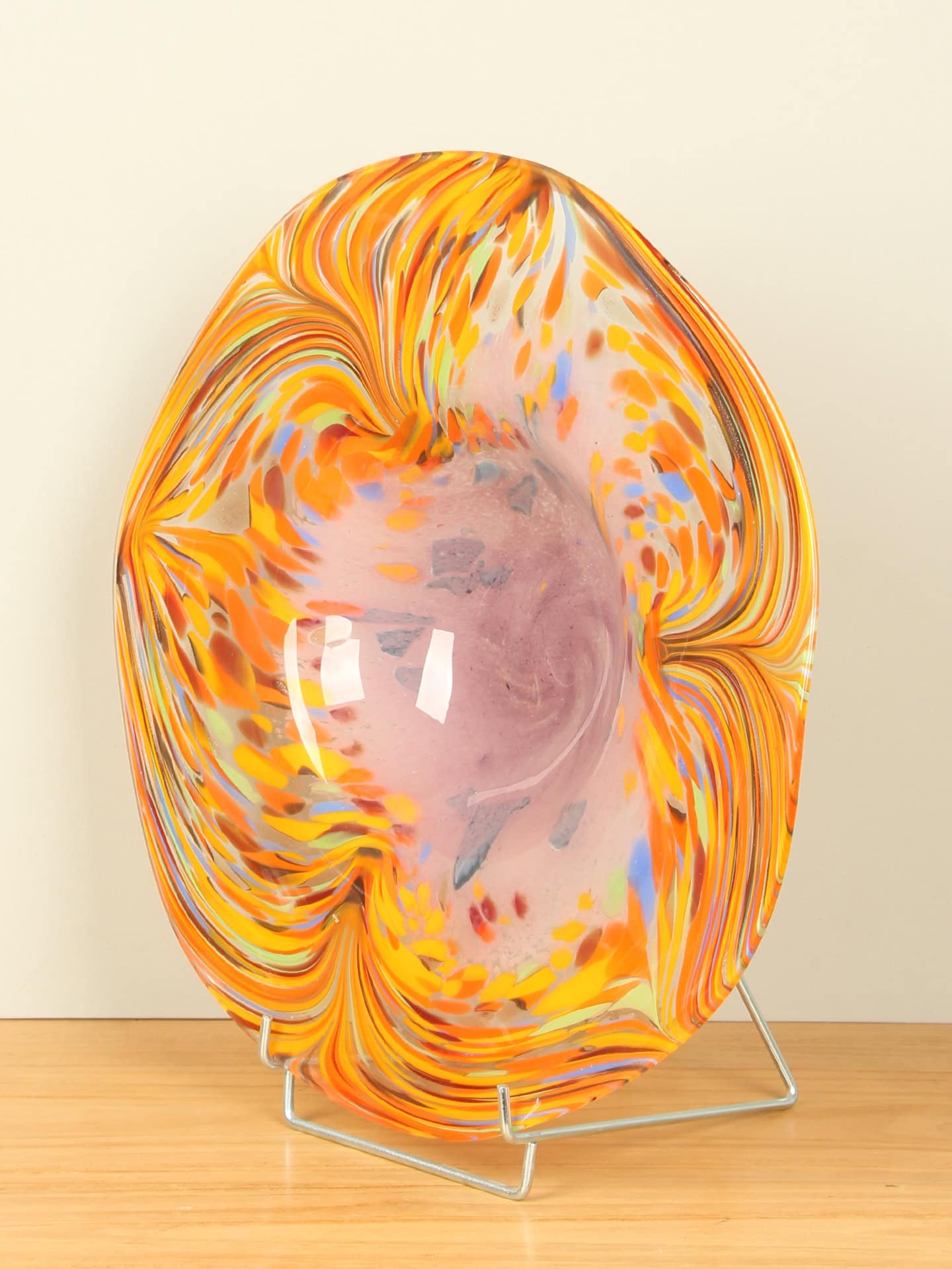 Diese handgefertigte Glasschale ist ein wahres Kunstwerk. Farben und Linien fließen harmonisch durch das Glas und machen jede Schale zu einem Unikat. Da jedes Stück handgefertigt ist, kann Ihre Schale leicht vom Foto abweichen – ein Zeichen echter Handwerkskunst. Ein wunderschönes Stück für Tisch, Sideboard oder Podest.