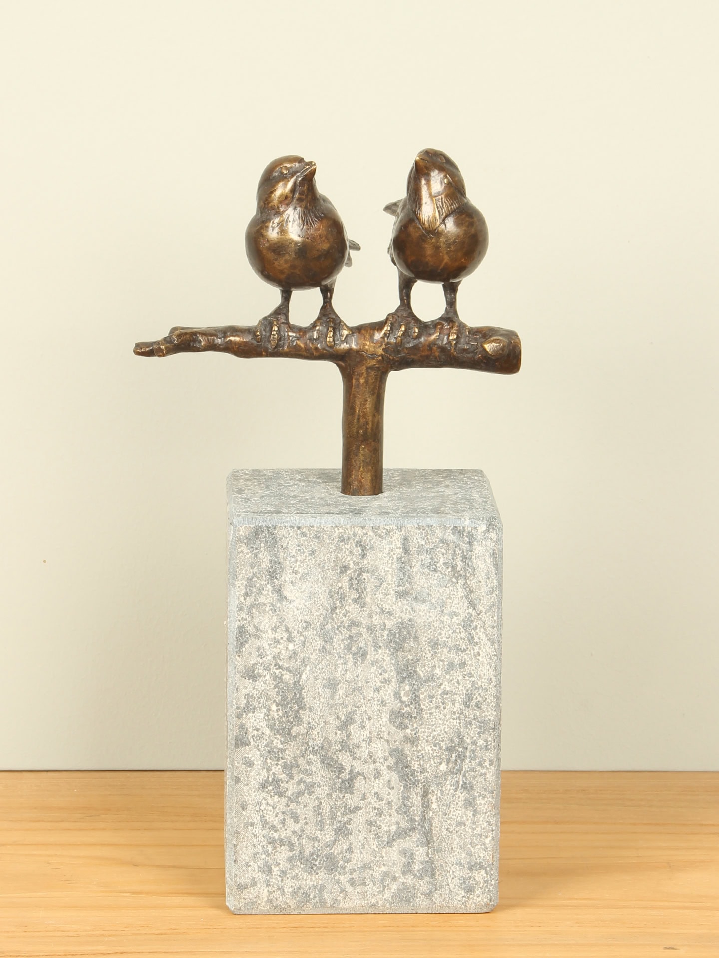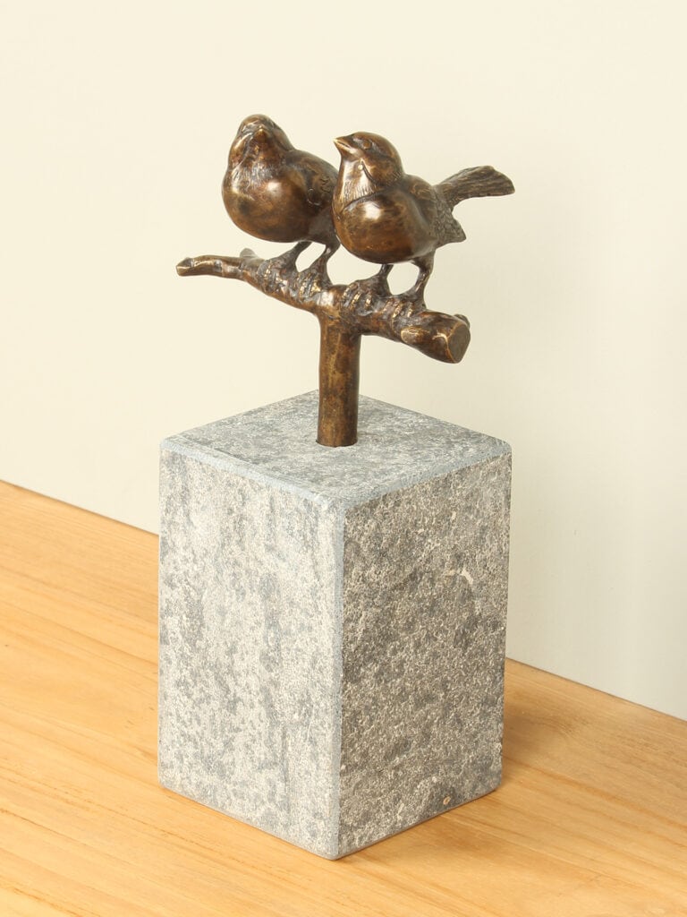 Skulptur für drinnen oder draußen – Bronze – 2 Spatzen auf einem Ast – 17x15x10 cm