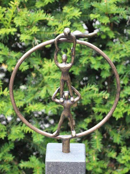 Die Bronzeskulptur „Drei Personen im Kreis“ ist ein bemerkenswertes Kunstwerk, das auf subtile und doch eindrucksvolle Weise die Kraft von Zusammenarbeit und gegenseitigem Vertrauen darstellt. Die drei Figuren stehen in einem Kreisbogen am Himmel, jede stützt oder hebt die andere. Es ist eine spielerische, fast akrobatische Komposition, die jedoch tief symbolisch ist: Nur gemeinsam können wir mehr erreichen. Der Kreis symbolisiert die Unendlichkeit, eine Verbindung ohne Anfang und Ende, und unterstreicht, dass wahre Zusammenarbeit umso stärker wird, je mehr sich die Beteiligten gegenseitig unterstützen.