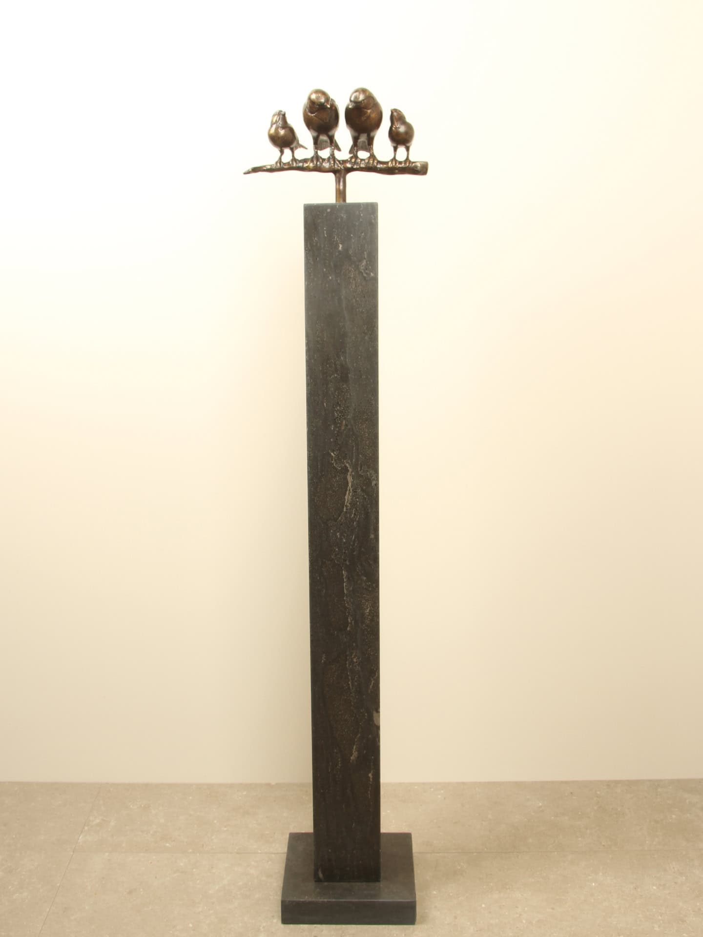 Skulptur für drinnen oder draußen – Bronze – Familie Spatzen auf einem Ast – 17x26x12 cm