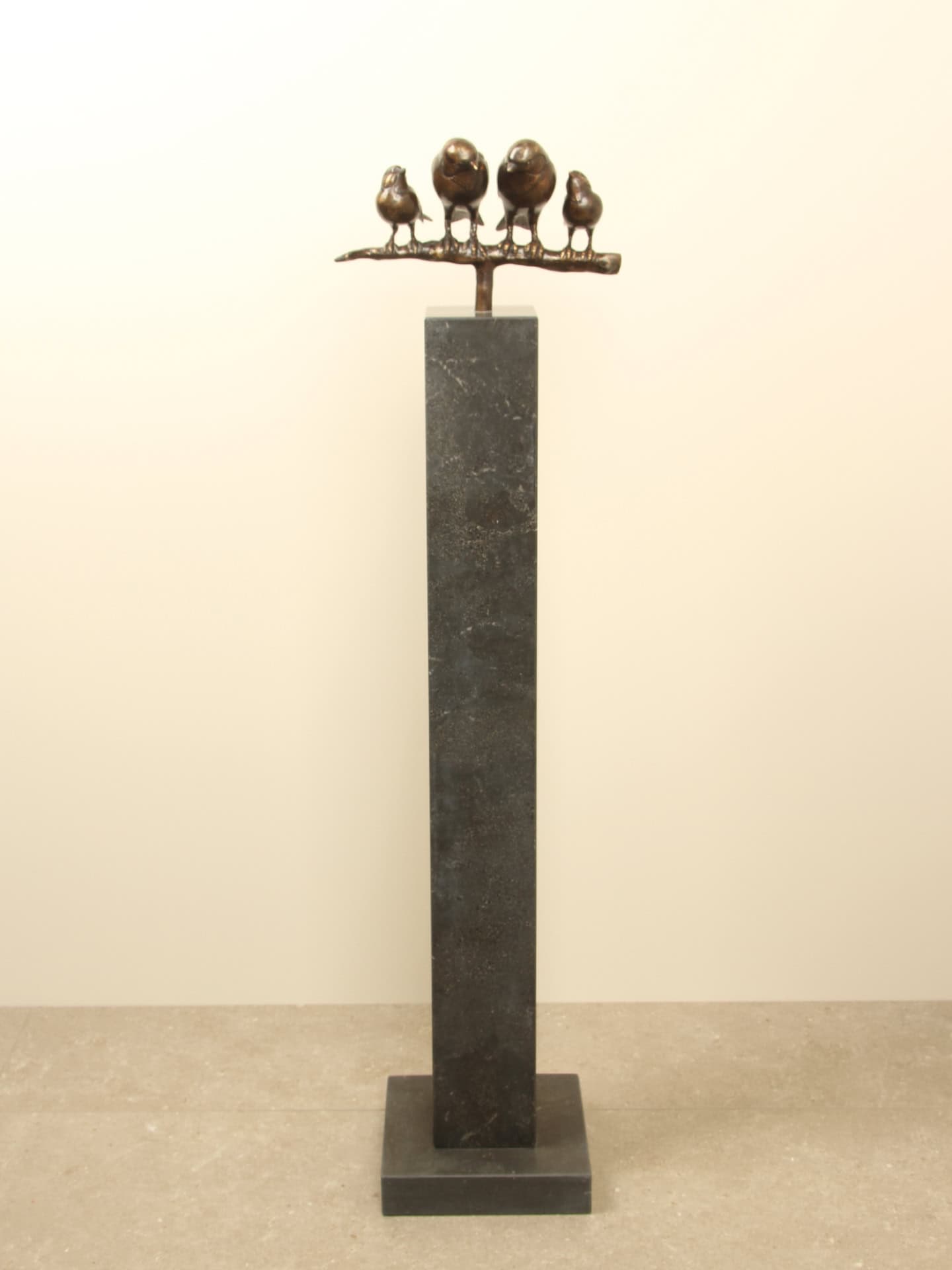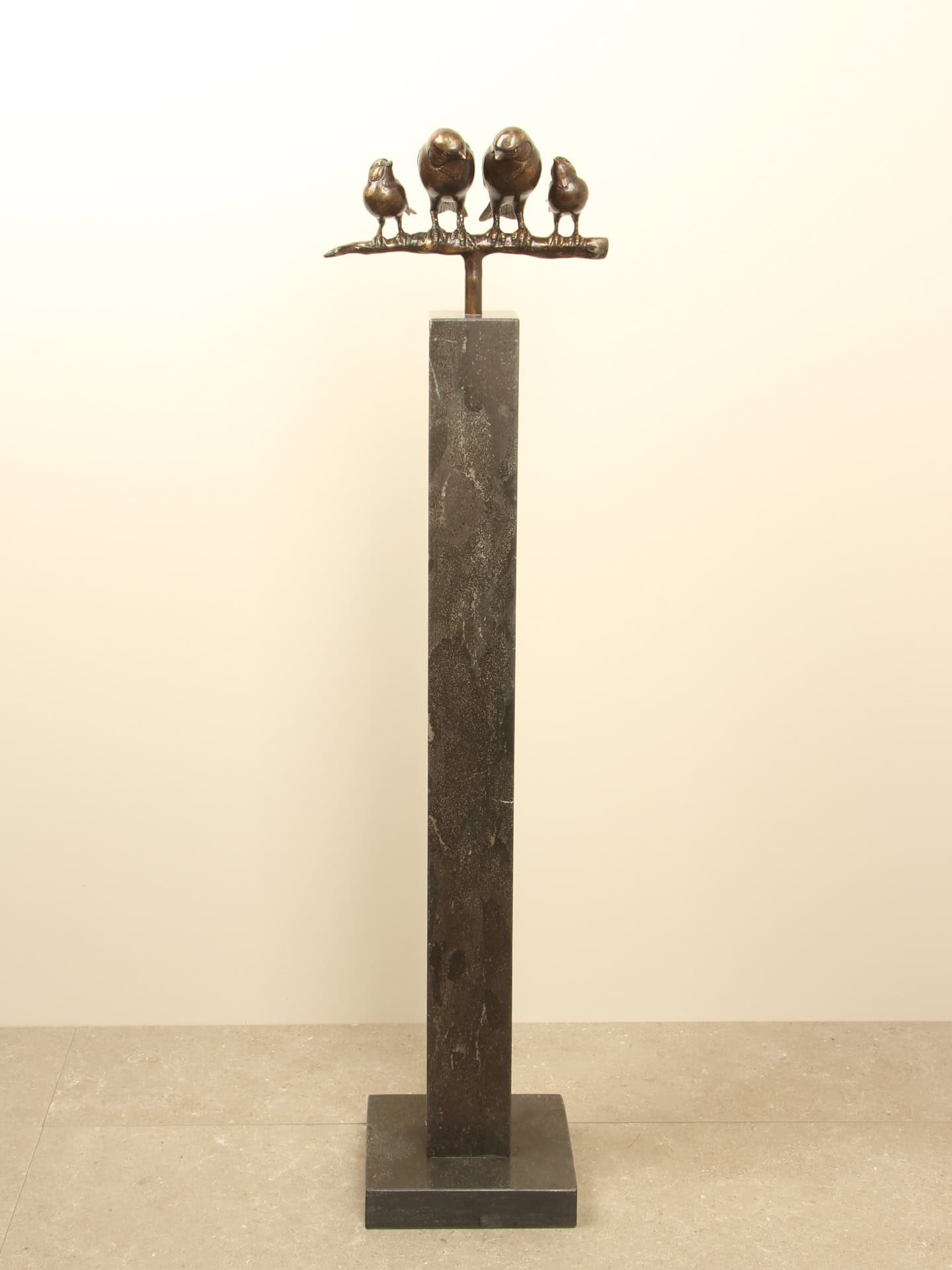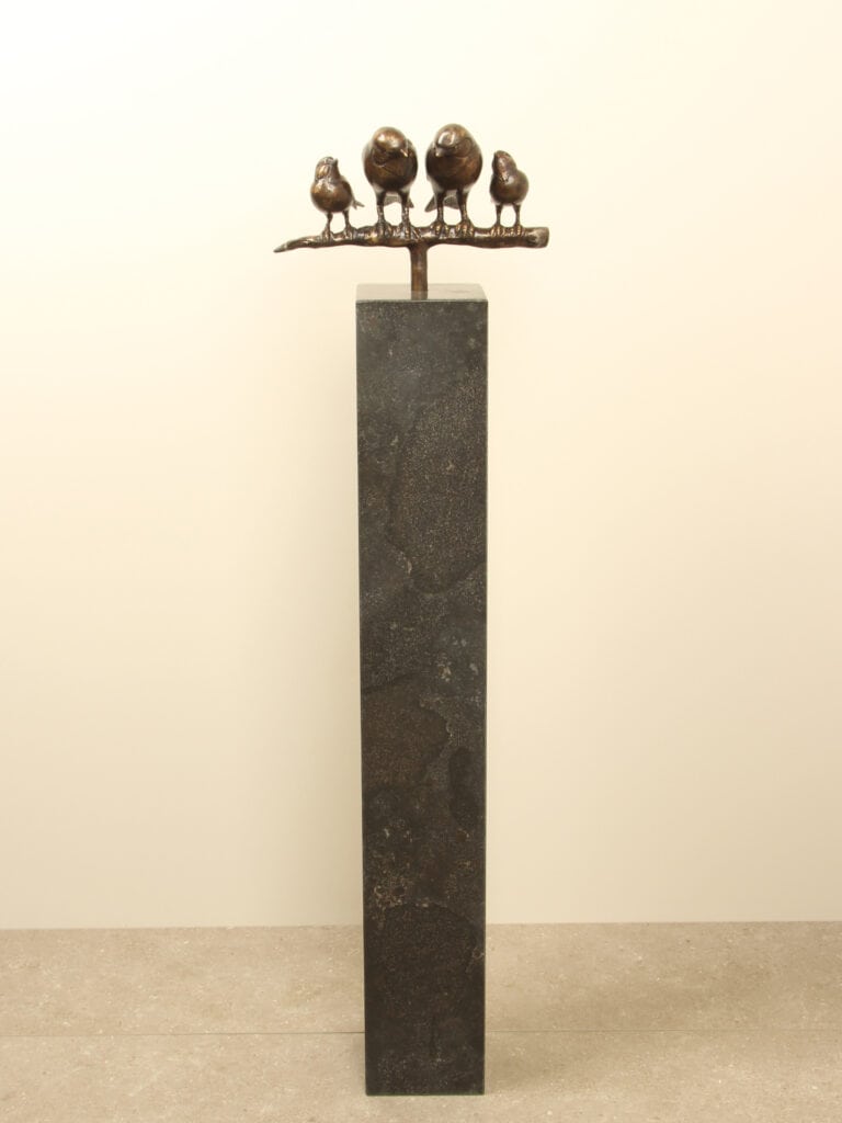 Die Bronzeskulptur „Sperlingsfamilie auf einem Ast“ zeigt eine herzerwärmende Szene von vier eng beieinander sitzenden Sperlingen. Sie symbolisiert Verbundenheit, Fürsorge und Solidarität. Die Skulptur steht auf einem stabilen Rohr mit 16 mm Durchmesser und passt somit hervorragend zu einem unserer Sockel mit passender vorgebohrter Öffnung. Geeignet für den Innen- und Außenbereich.