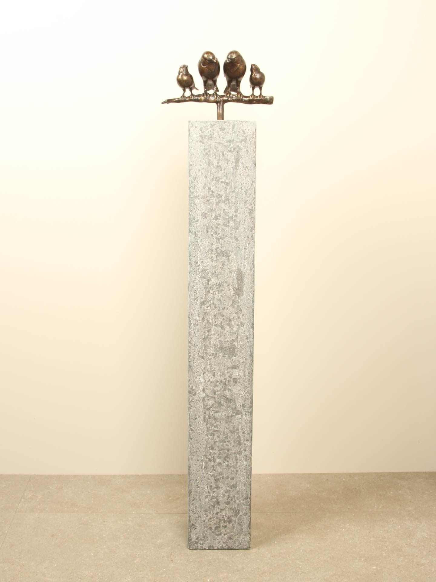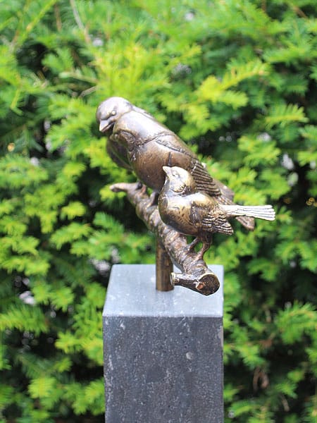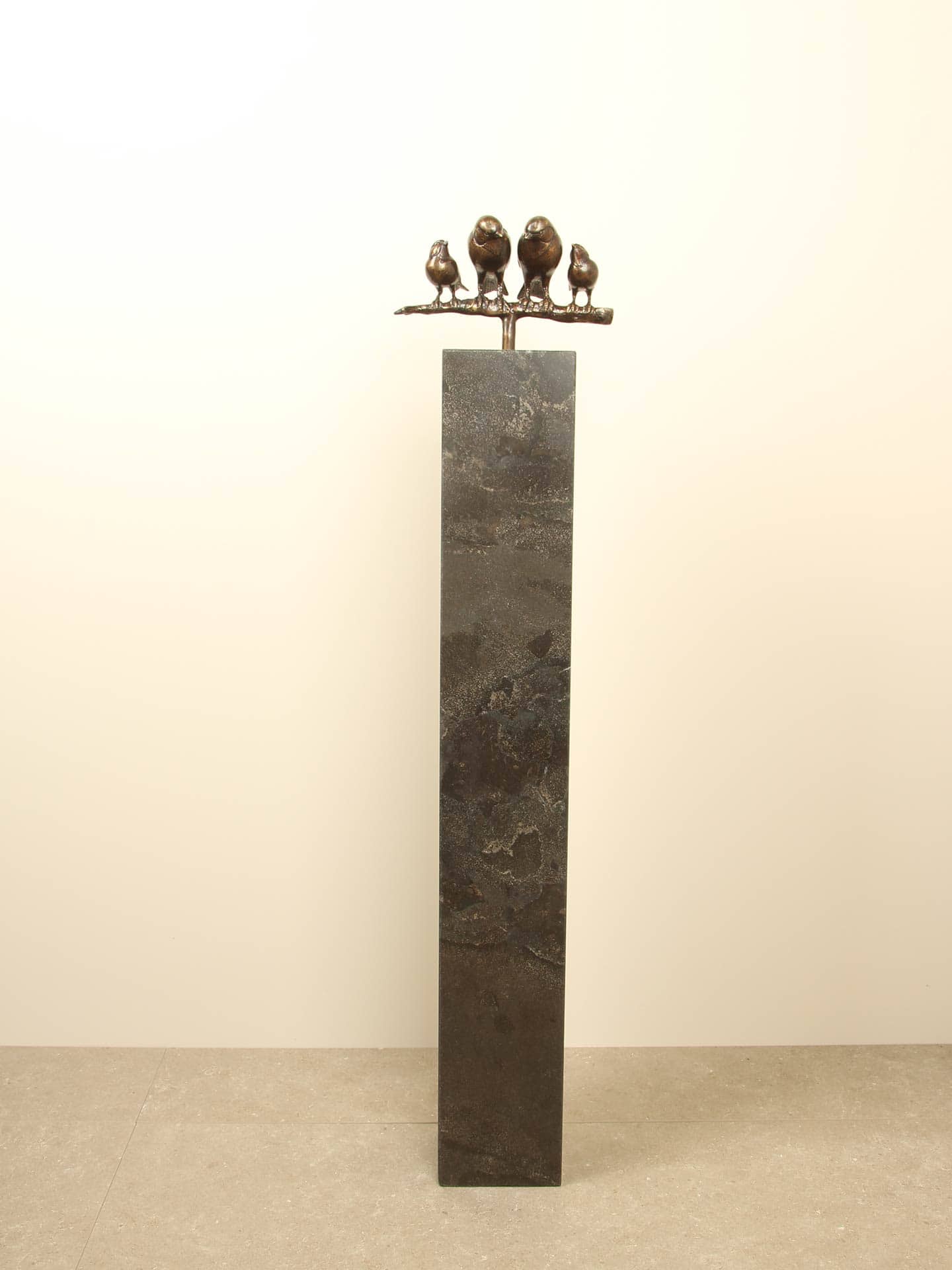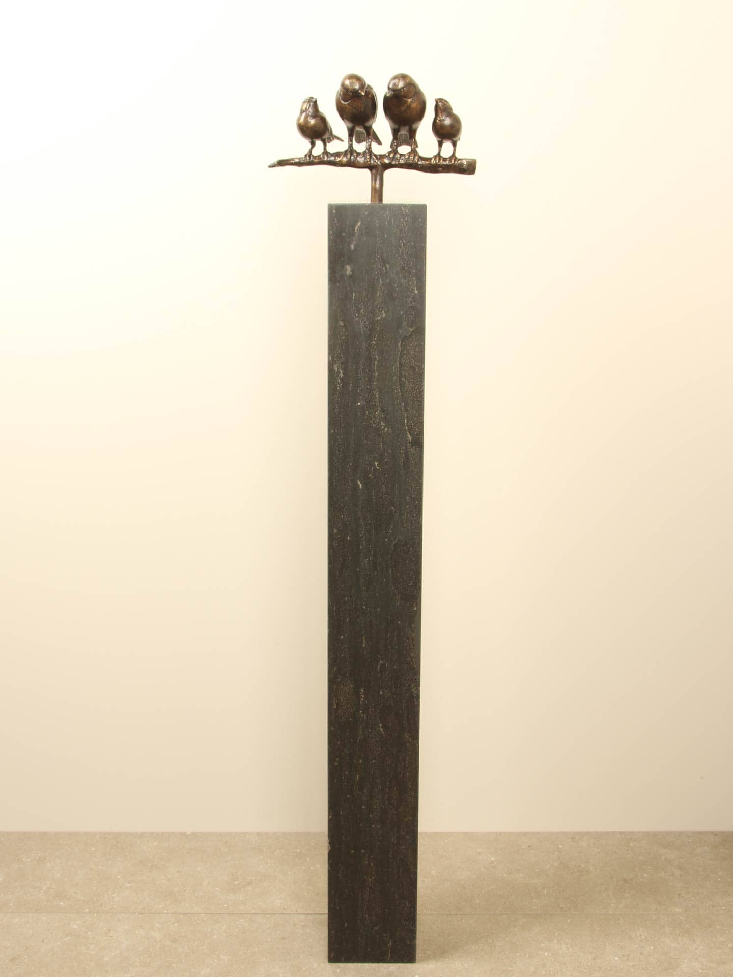 Die Bronzeskulptur „Sperlingsfamilie auf einem Ast“ zeigt eine herzerwärmende Szene von vier eng beieinander sitzenden Sperlingen. Sie symbolisiert Verbundenheit, Fürsorge und Solidarität. Die Skulptur steht auf einem stabilen Rohr mit 16 mm Durchmesser und passt somit hervorragend zu einem unserer Sockel mit passender vorgebohrter Öffnung. Geeignet für den Innen- und Außenbereich.