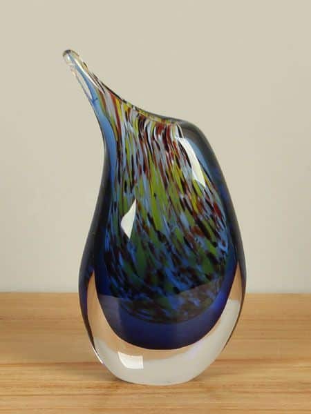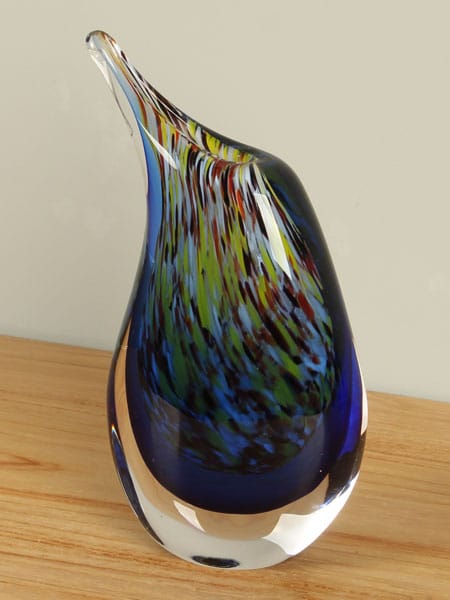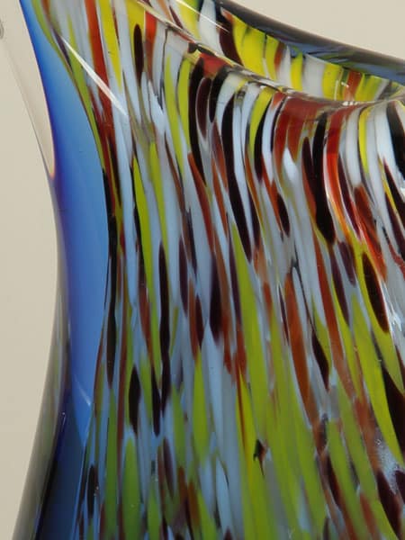 Diese Vase ist ein Glaskunstwerk, entstanden im Augenblick ihrer Entstehung. Beim Drehen und Formen des heißen Glases vermischen sich die Farben auf unkontrollierbare, natürliche Weise. So entwickelt jede Vase ihren ganz eigenen Charakter – mal verspielt und farbenfroh, mal zurückhaltender –, aber immer mit einer einzigartigen, unnachahmlichen Note.