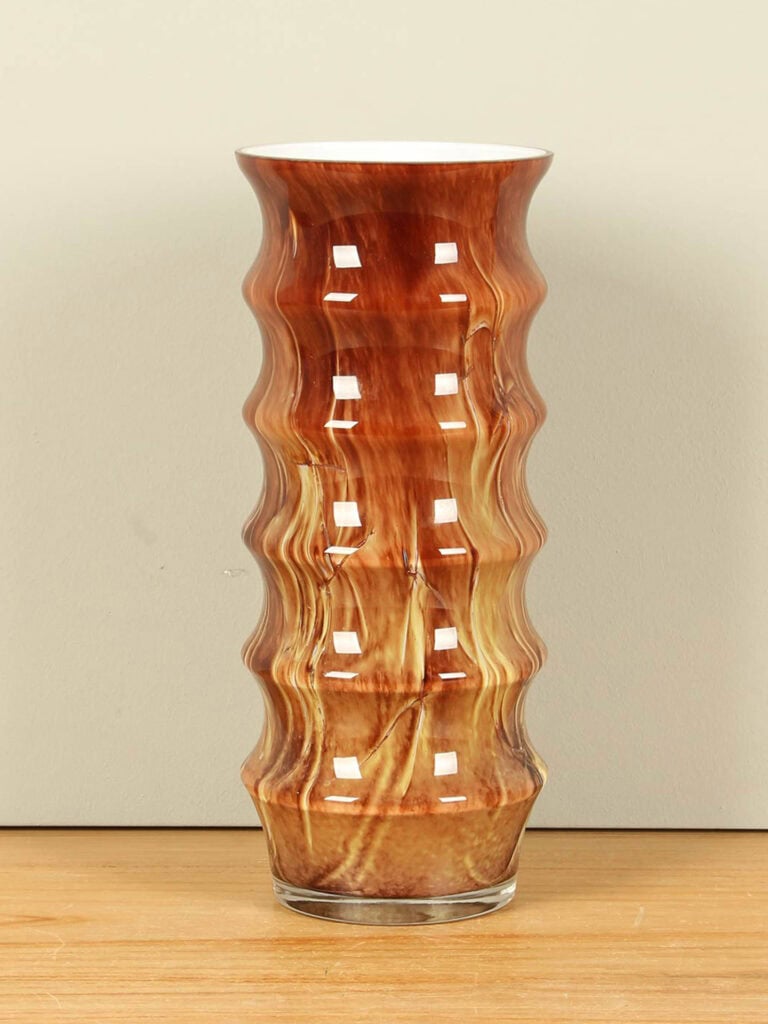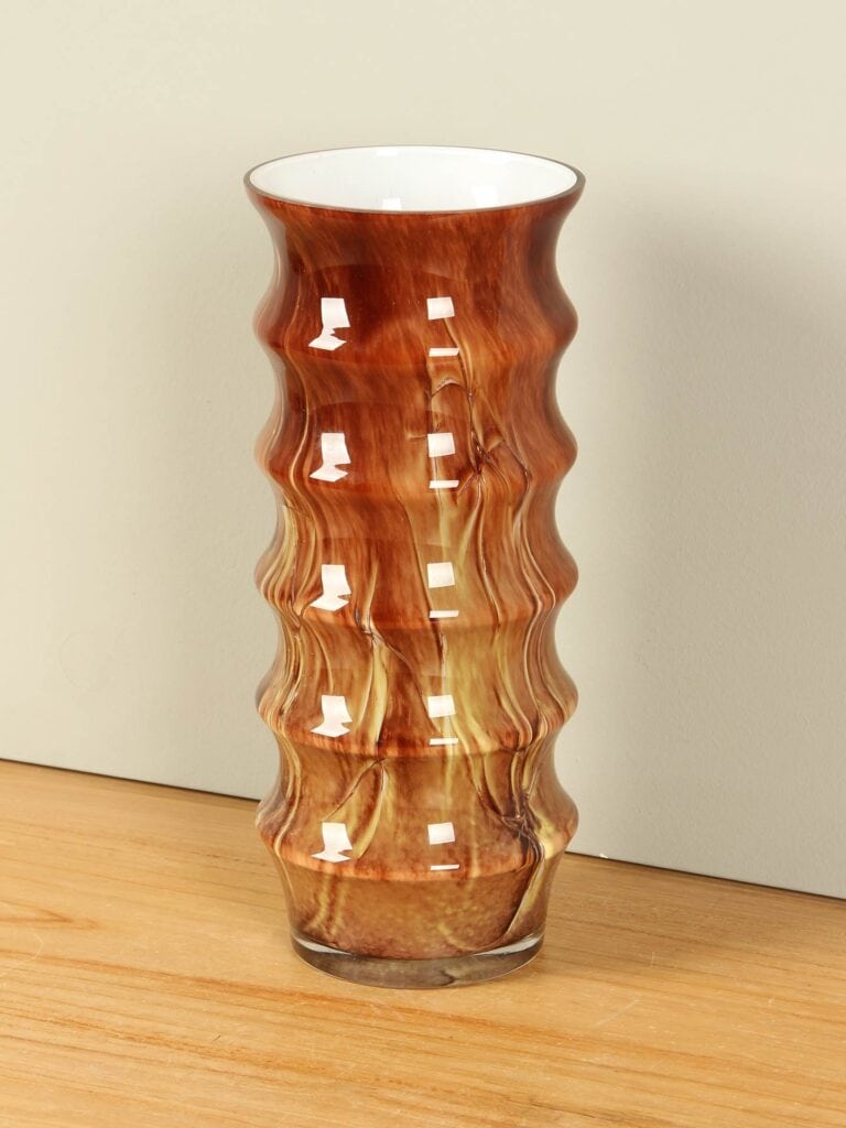 Diese handgefertigte Glasvase ist ein Unikat, das beim Formen des heißen Glases entsteht. Farben und Linien entwickeln sich auf natürliche Weise, sodass keine Vase der anderen gleicht. Daher kann Ihr Exemplar leicht vom Foto abweichen – und genau das macht es so besonders. Sieht wunderschön auf einem Tisch, einer Fensterbank oder einem passenden Sockel aus.