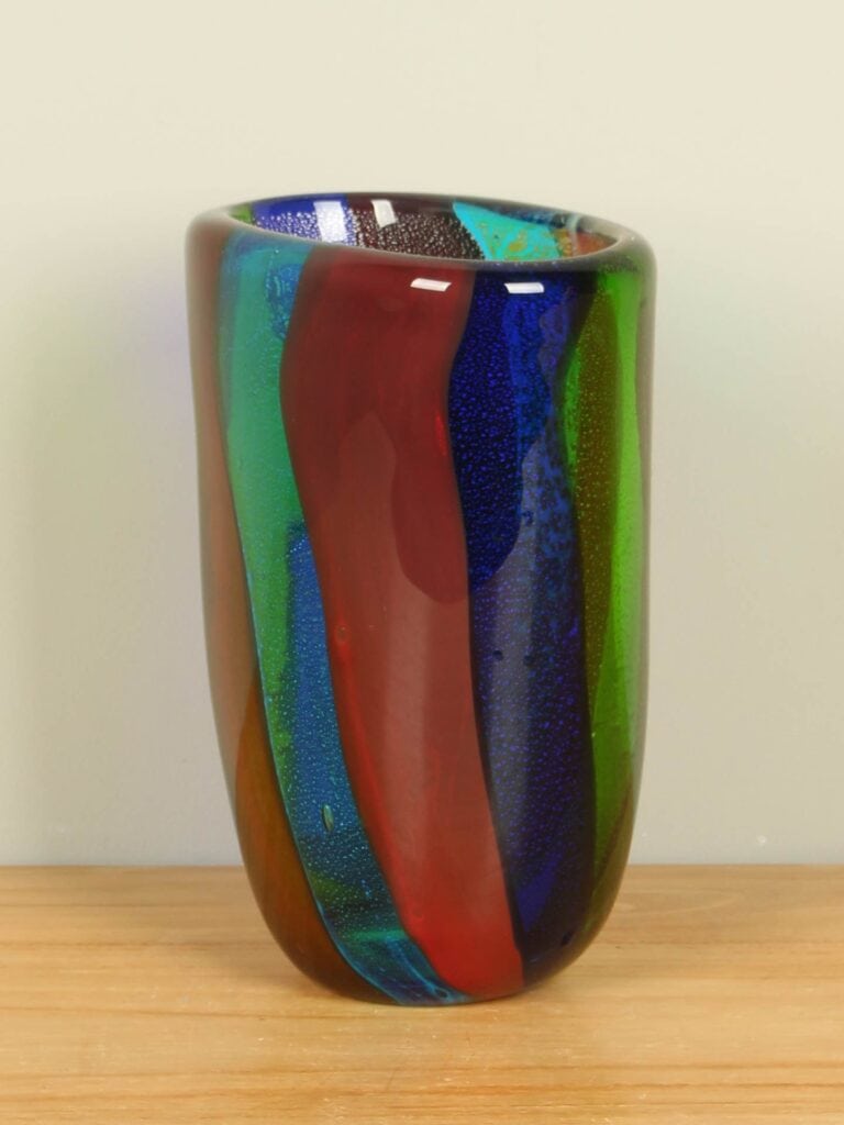 Diese Vase ist ein Glaskunstwerk, entstanden im Augenblick ihrer Entstehung. Beim Drehen und Formen des heißen Glases vermischen sich die Farben auf unkontrollierbare, natürliche Weise. So entwickelt jede Vase ihren ganz eigenen Charakter – mal verspielt und farbenfroh, mal zurückhaltender –, aber immer mit einer einzigartigen, unnachahmlichen Note.