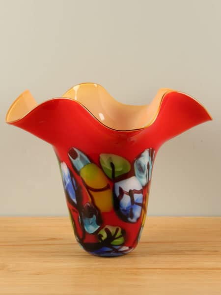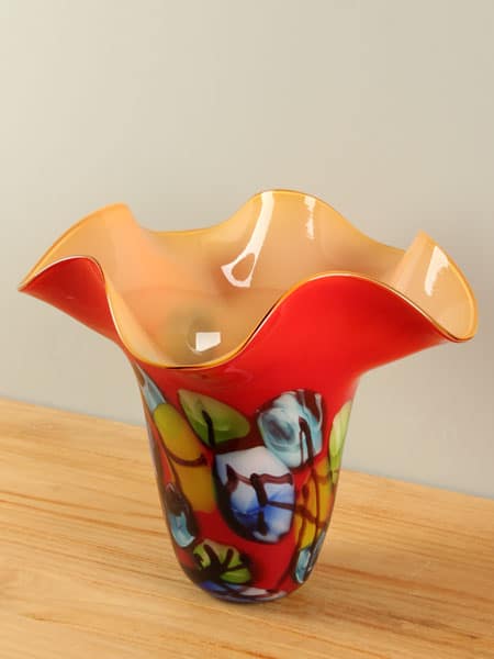 Diese Vase ist ein Glaskunstwerk, entstanden im Augenblick ihrer Entstehung. Beim Drehen und Formen des heißen Glases vermischen sich die Farben auf unkontrollierbare, natürliche Weise. So entwickelt jede Vase ihren ganz eigenen Charakter – mal verspielt und farbenfroh, mal zurückhaltender –, aber immer mit einer einzigartigen, unnachahmlichen Note.
