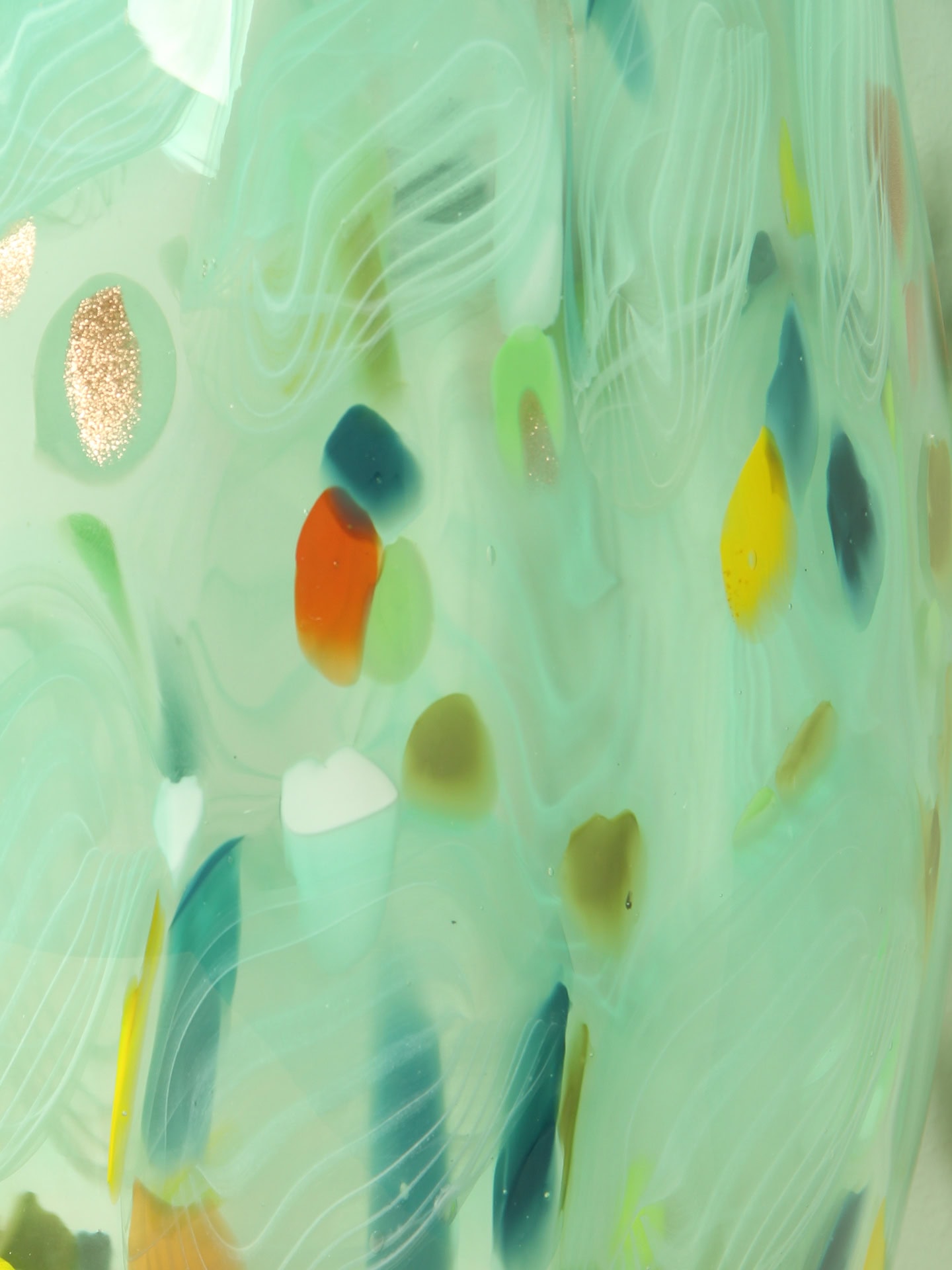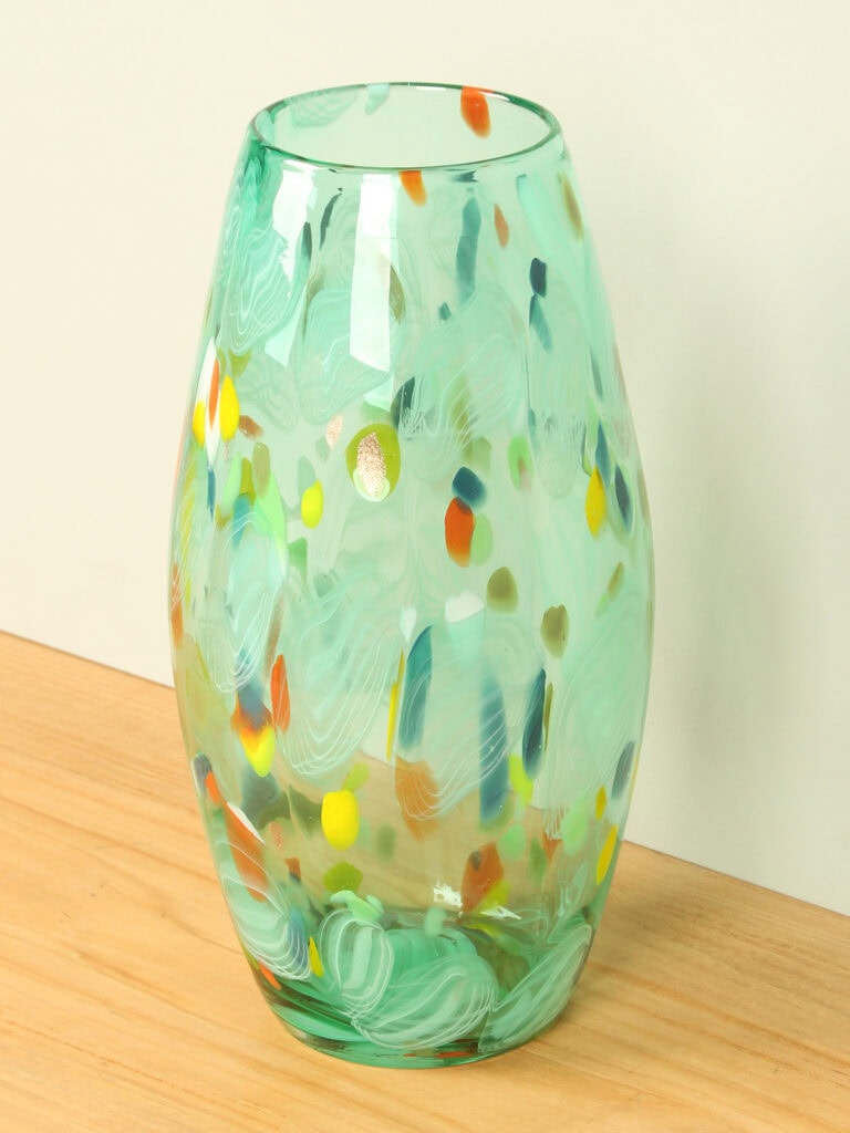 Diese Vase ist ein Glaskunstwerk, entstanden im Augenblick ihrer Entstehung. Beim Drehen und Formen des heißen Glases vermischen sich die Farben auf unkontrollierbare, natürliche Weise. So entwickelt jede Vase ihren ganz eigenen Charakter – mal verspielt und farbenfroh, mal zurückhaltender –, aber immer mit einer einzigartigen, unnachahmlichen Note.