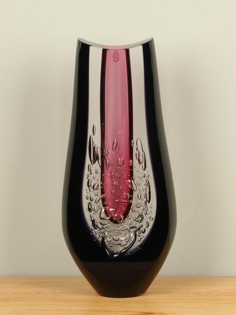 Diese handgeschliffene Kristallvase besticht durch ihre außergewöhnliche Tiefenwirkung: Der tiefviolette Kern scheint inmitten leuchtender Bläschenstrukturen zu schweben. Der kunstvolle Schliff lässt jedes Funkeln lebendig wirken. Eine elegante, moderne Vase, die als Kunstwerk für sich steht und das Licht wunderschön einfängt.