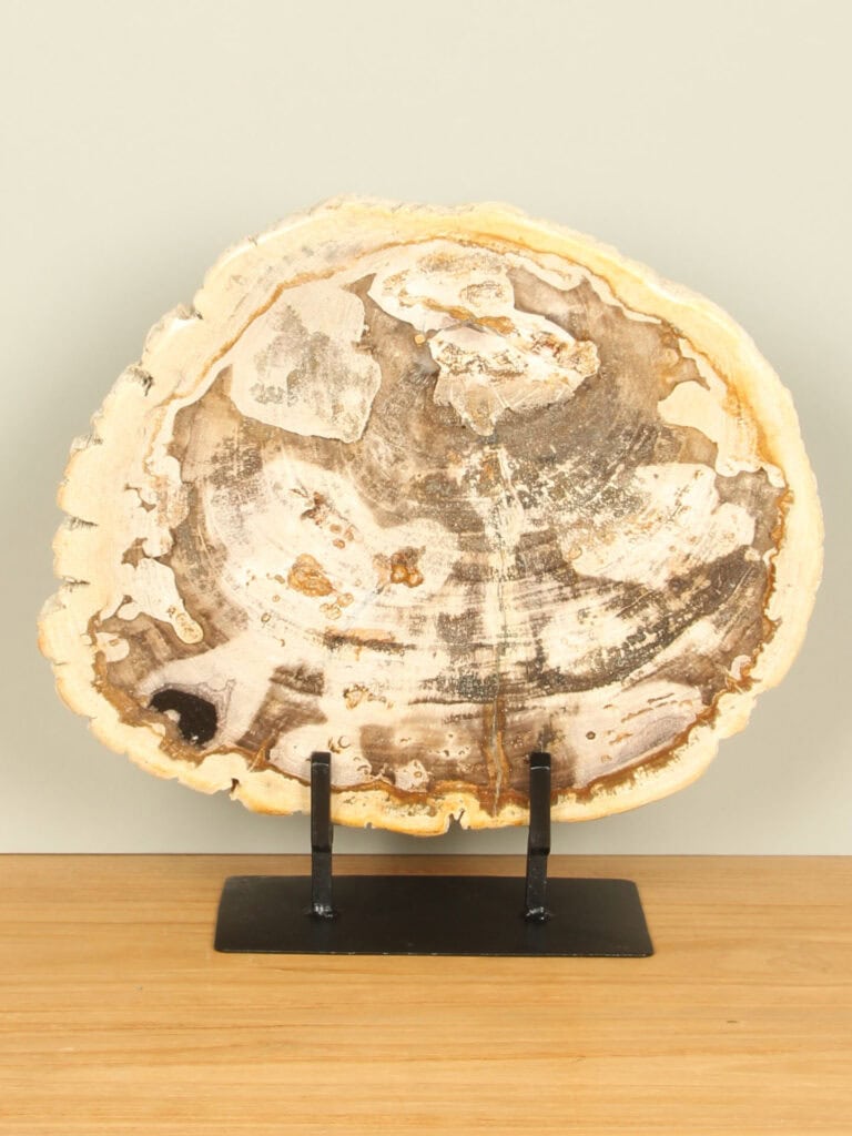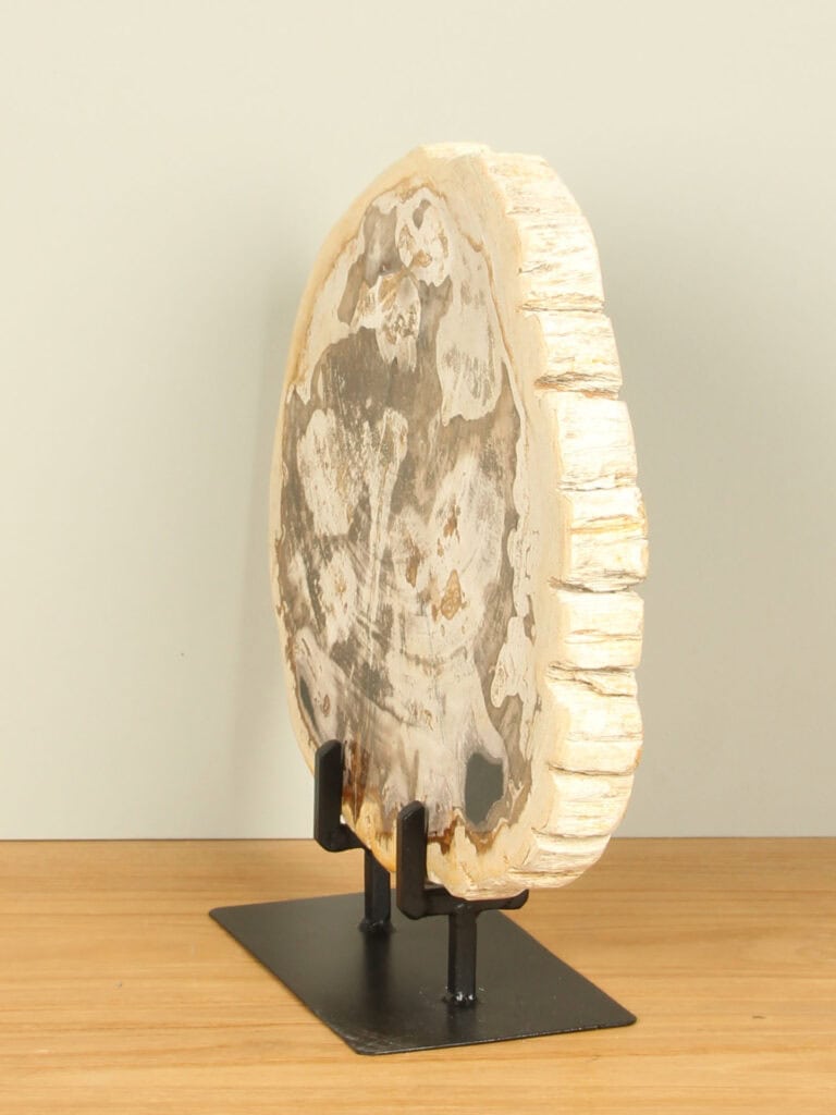 Diese einzigartige, versteinerte Holzplatte auf einem Ständer ist ein wahres Naturkunstwerk, entstanden durch Millionen Jahre Druck, Hitze und Mineralisierung. Das Ergebnis ist ein einzigartiges, organisches Muster, das an die Jahresringe einer uralten, zeitlosen Welt erinnert. Die teilpolierte Oberfläche unterstreicht den natürlichen Glanz, ohne den ursprünglichen Charakter zu beeinträchtigen. Wunderschön als Akzent in Ihrem Interieur oder als dekoratives Element. Ein exklusives Einzelstück, denn keine Platte gleicht der anderen.