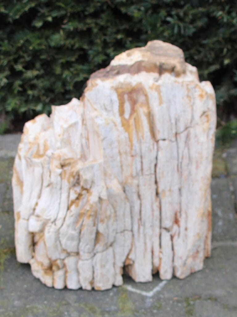 Versteinertes Holz ist wohl eines der außergewöhnlichsten Materialien, die man in Innenräumen oder im Garten verwenden kann. Dieses Stück versteinertes Holz ist wirklich einzigartig – es handelt sich um ein Fossil, das etwa 2 bis 2,5 Millionen Jahre alt ist. Einst ein lebender Baum, wurde er über Millionen von Jahren vollständig in Stein verwandelt. Natürlicher Druck und Mineralisierung haben die Holzzellen unter anderem durch Quarz ersetzt. Dadurch bleibt die ursprüngliche Holzmaserung sichtbar, während das Material die Härte und Beständigkeit von Stein erhält.
