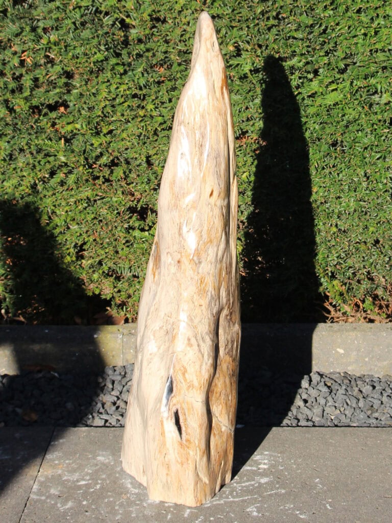 Versteinertes Holz ist wohl eines der außergewöhnlichsten Materialien, die man in Innenräumen oder im Garten verwenden kann. Dieses Stück versteinertes Holz ist wirklich einzigartig – es handelt sich um ein Fossil, das etwa 2 bis 2,5 Millionen Jahre alt ist. Einst ein lebender Baum, wurde er über Millionen von Jahren vollständig in Stein verwandelt. Natürlicher Druck und Mineralisierung haben die Holzzellen unter anderem durch Quarz ersetzt. Dadurch bleibt die ursprüngliche Holzmaserung sichtbar, während das Material die Härte und Beständigkeit von Stein erhält.